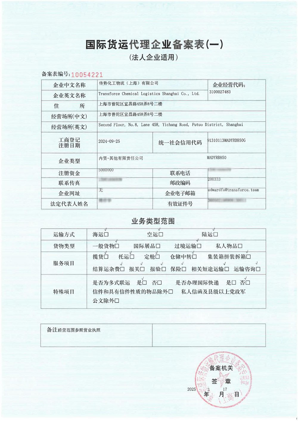 Transforce Chemical Logistics (Shanghai) Co., Ltd. is a first-class freight forwarding company specializing in international cargo transportation approved by the Ministry of Commerce and registered by the State Administration for Industry and Commerce, headquartered on the banks of the East Bund River in Yangpu District, Shanghai.